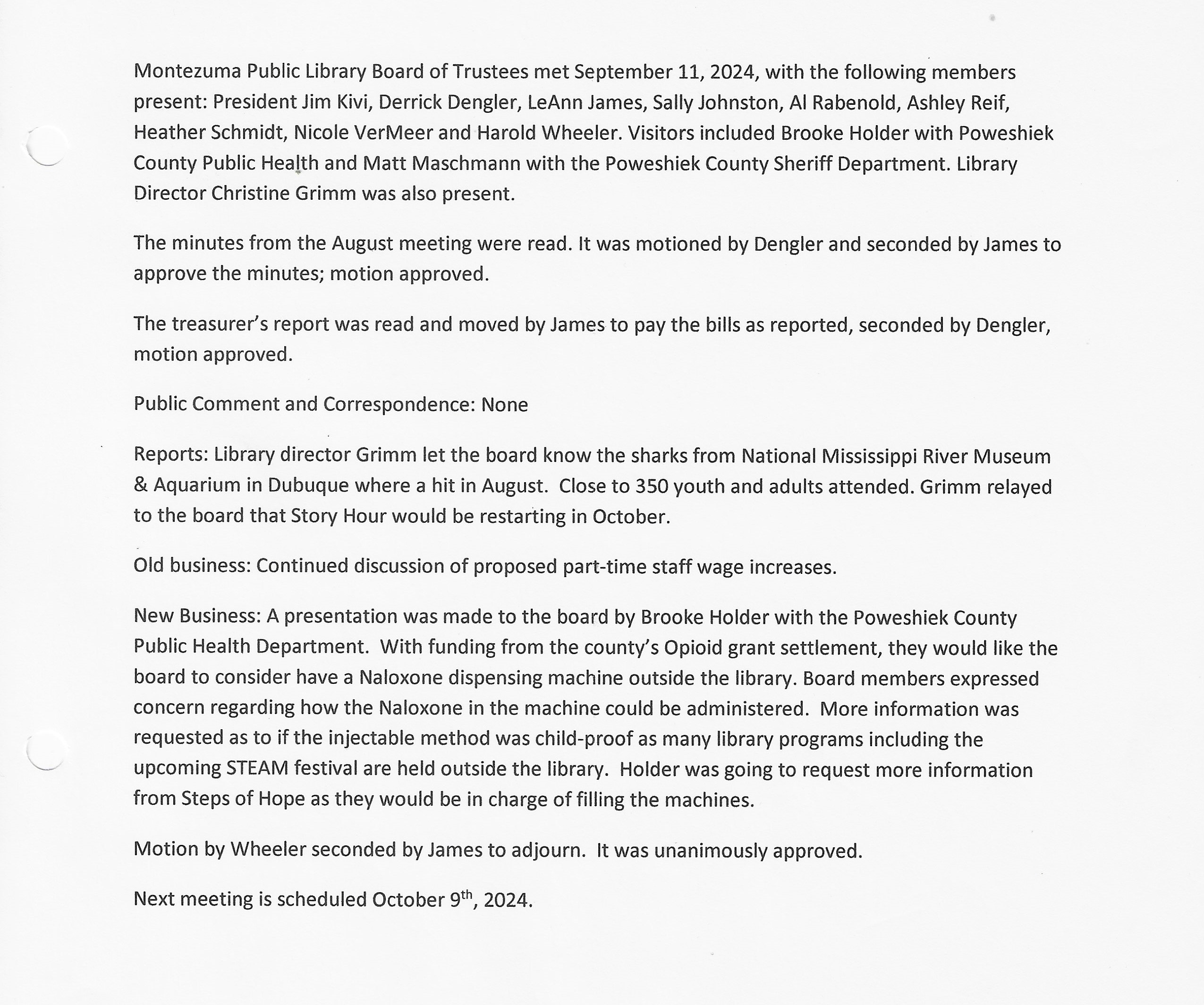 Montezuma Public Library Board of Trustees met June 12, 2024, with the following members present: Jim Kivi, Harold Wheeler, Sally Johnston, Heather Schmidt, Derrick Dengler, Ashley Reif. Library Director Christine Grimm was also present. Absent were: Al Rabenold, LeAnn James and Nicole VerMeer.