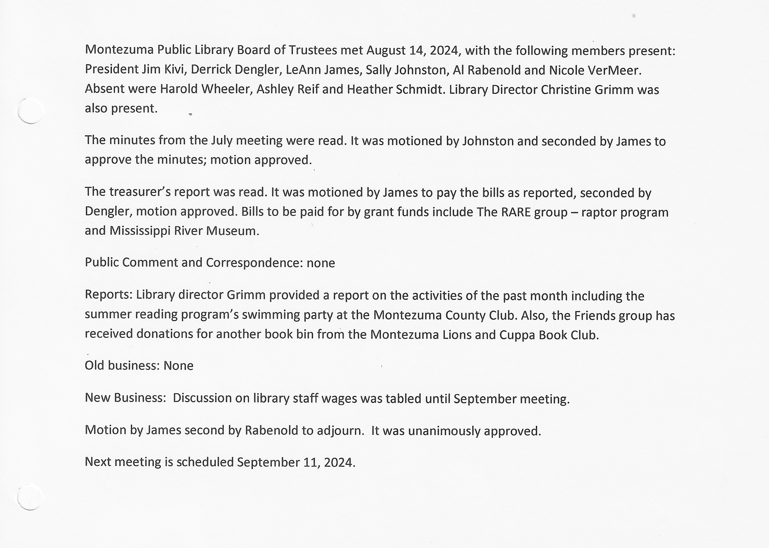 Montezuma Public Library Board of Trustees met on August 13th, 2025, with the following members present: President Jim Kivi, Derrick Dengler, LeAnn James, Al Rabenold, Heather Schmidt, Nicole VerMeer and Harold Wheeler. Absent was Ashley Reif. Library Director Christine Grimm was also present.